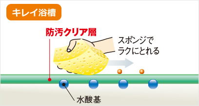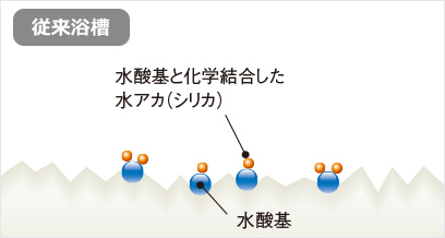 従来の浴槽だと、水アカ(シリカ)が水酸基と化学結合して汚れがこびりついてしまいます。