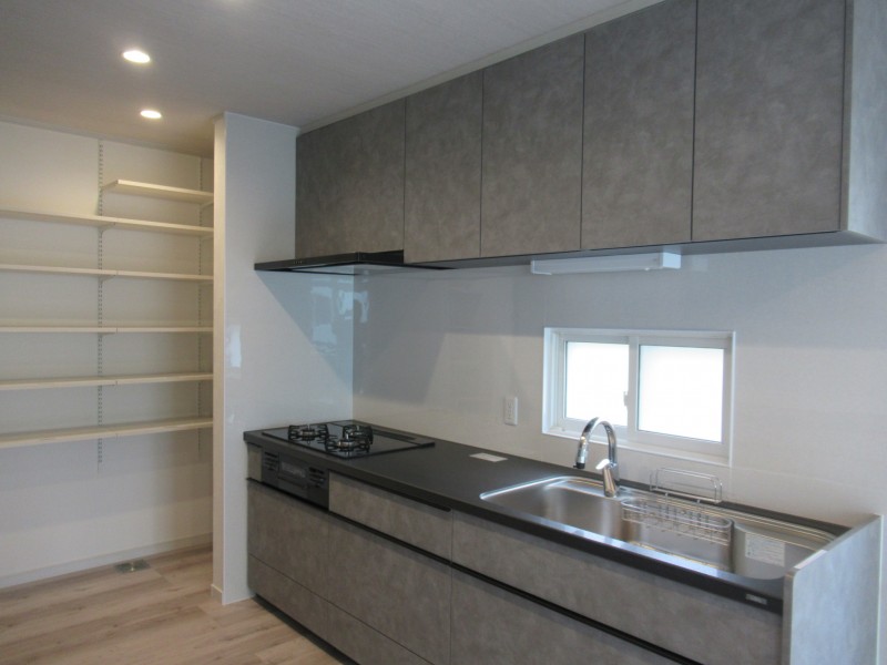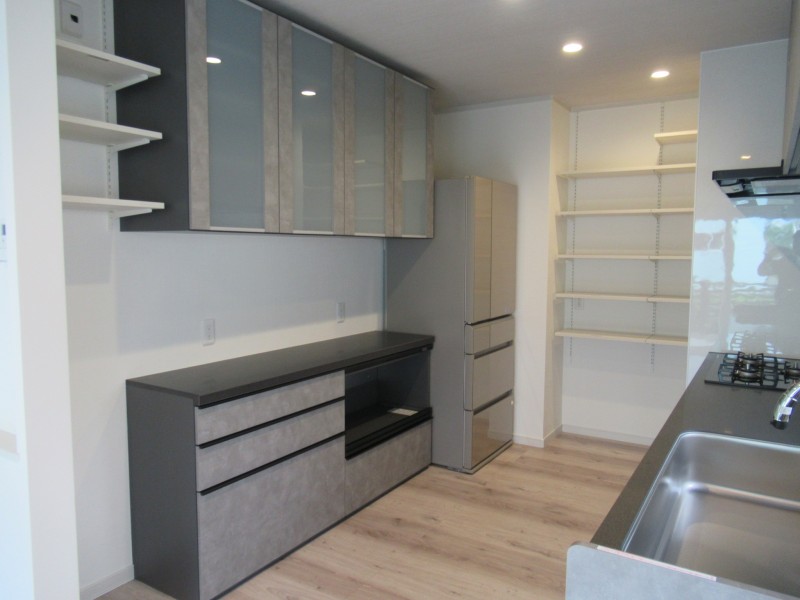 キッチン奥のデッドスペースを大容量のパントリーにし、キッチン/ダイニング・リビングからの続き間として和室を洋室にし、全体を統一感のある広々と使える空間としました。