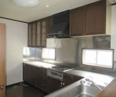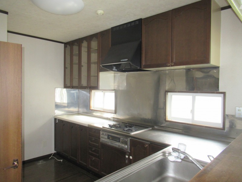 洗面の間取り・配置を変えることと、小さいサッシを塞ぐことで、キッチン位置を変更。