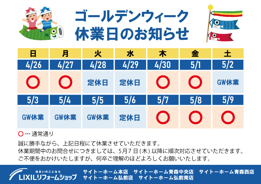 ゴールデンウィーク休業日のお知らせ