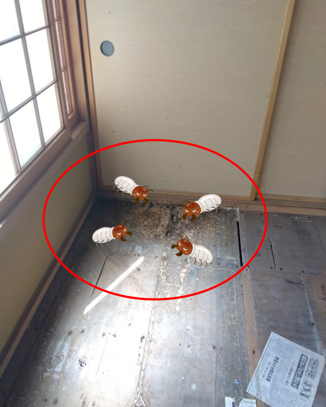 シロアリの羽アリを放置すると、木材を食べてしまうので大事な木材が空洞化して床を支えられなくなり